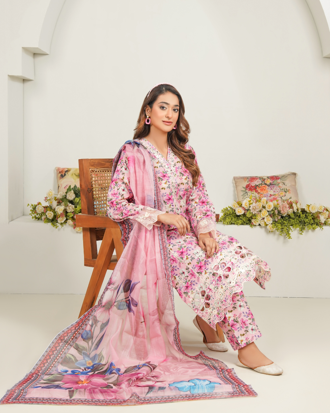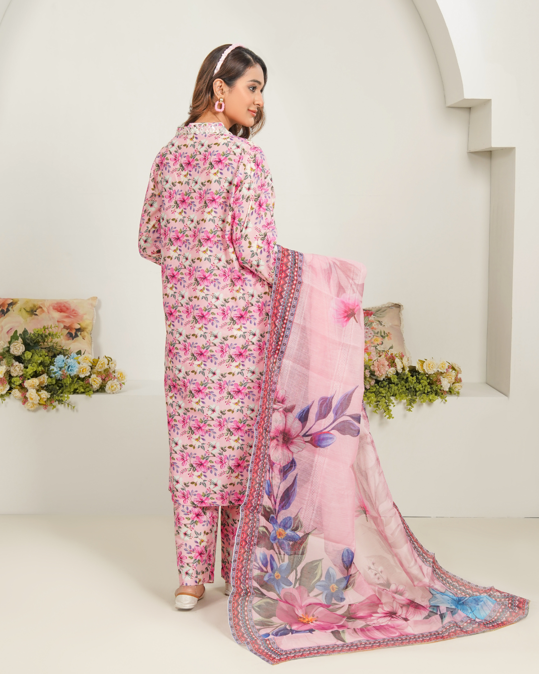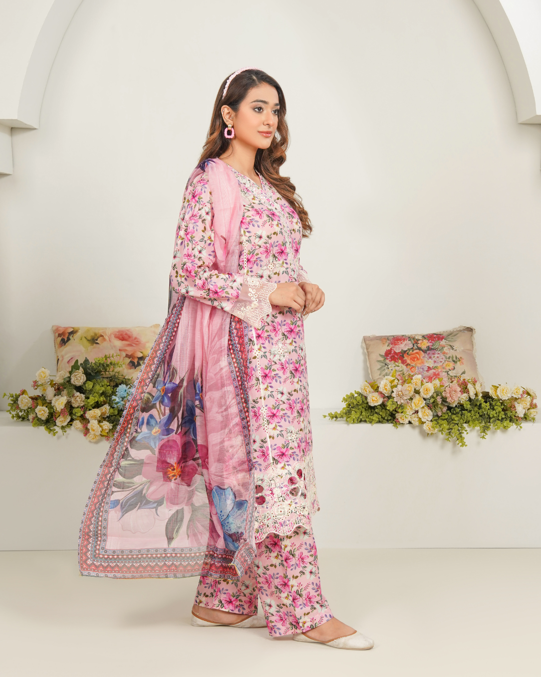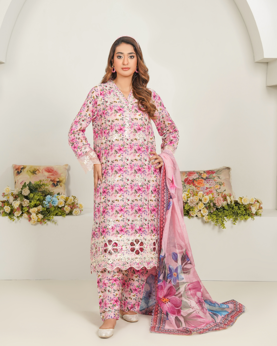 Bring a breath of fresh elegance to your wardrobe with our Blushing Flora Lawn Suit. This enchanting outfit features a soft pink base adorned with delicate floral prints, creating a look that’s both graceful and vibrant. The kurta is beautifully detailed with intricate lace on the sleeves and hem, adding a refined touch. A stunning chiffon dupatta with bold floral patterns completes the ensemble, making it perfect for summer luncheons, casual gatherings, or simply to brighten your everyday style.