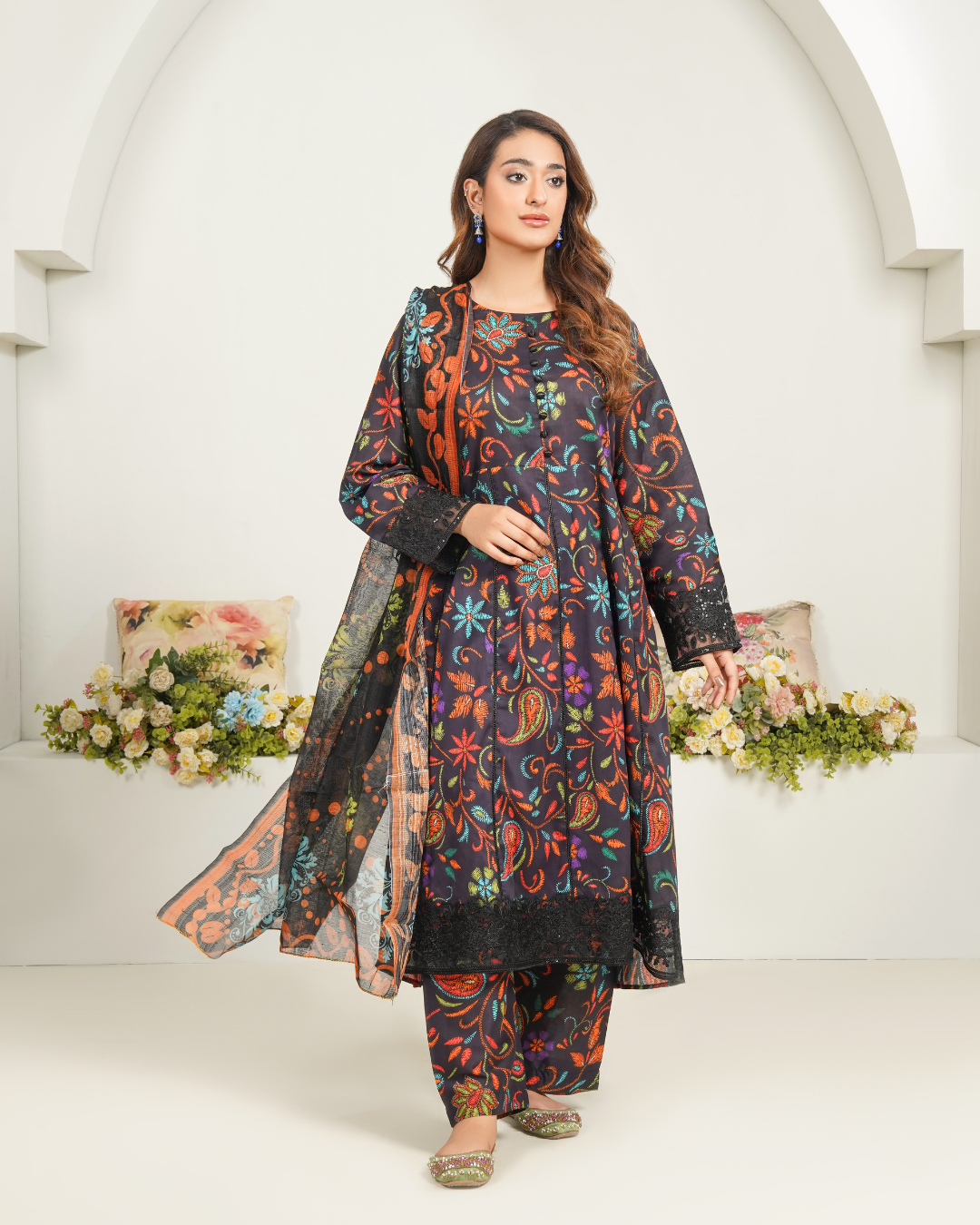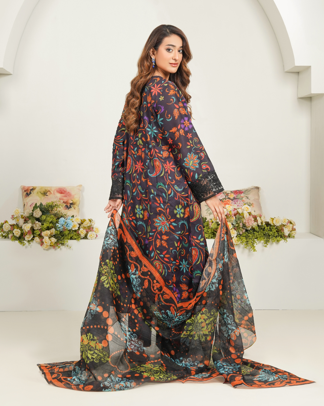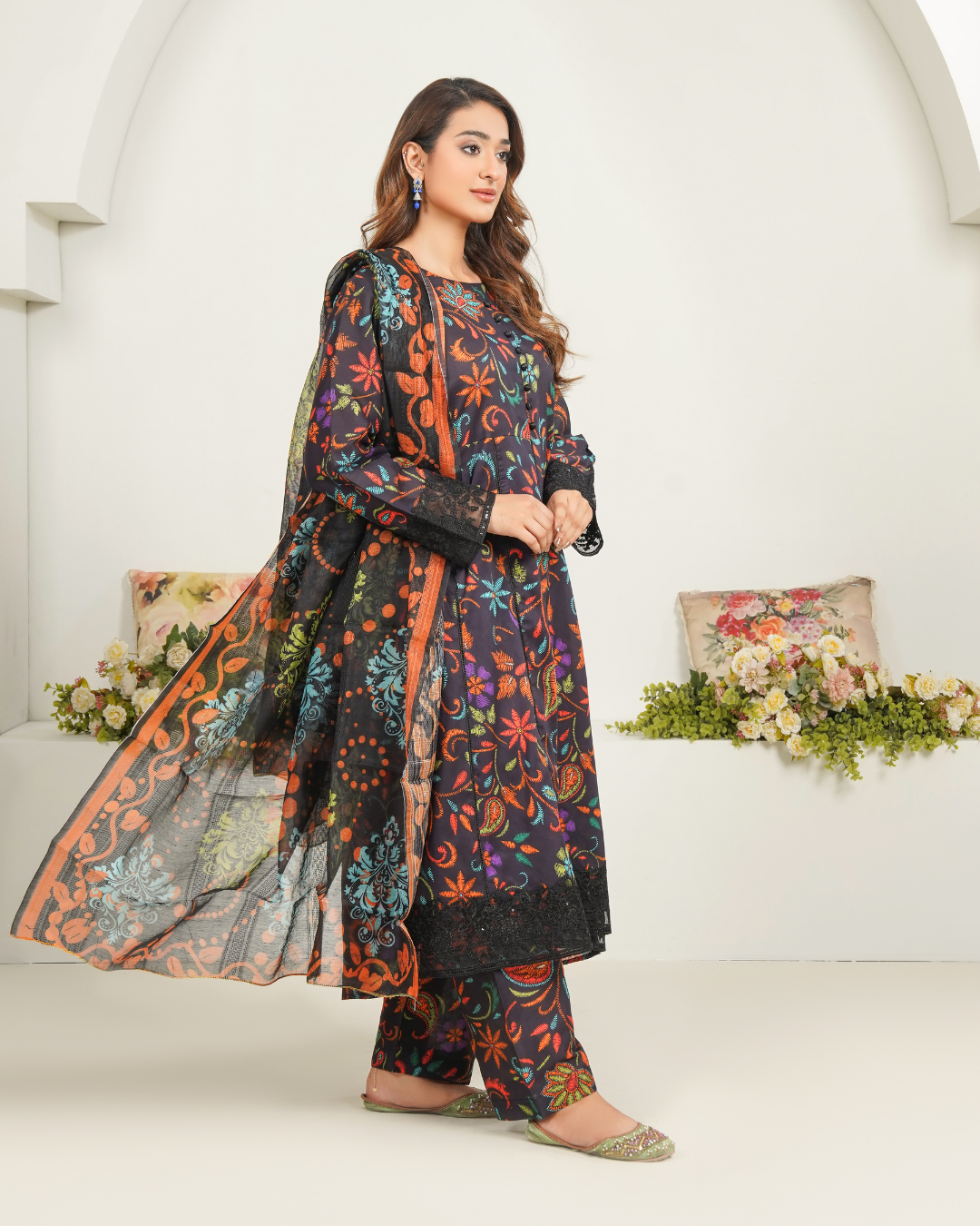 Unveil your vibrant side with our Midnight Garden Suit. This stunning ensemble features a rich black base adorned with lively multicolor floral and paisley patterns that create a striking statement. The intricate designs are beautifully complemented by a delicately embroidered dupatta and lace-detailed sleeves and hem, adding a touch of luxury to the outfit. Crafted from comfortable, breathable fabric, this suit is perfect for festive events, family gatherings, or adding flair to your everyday style.